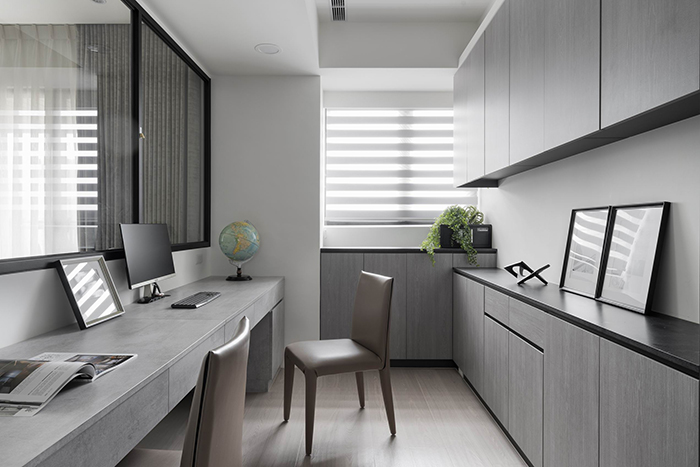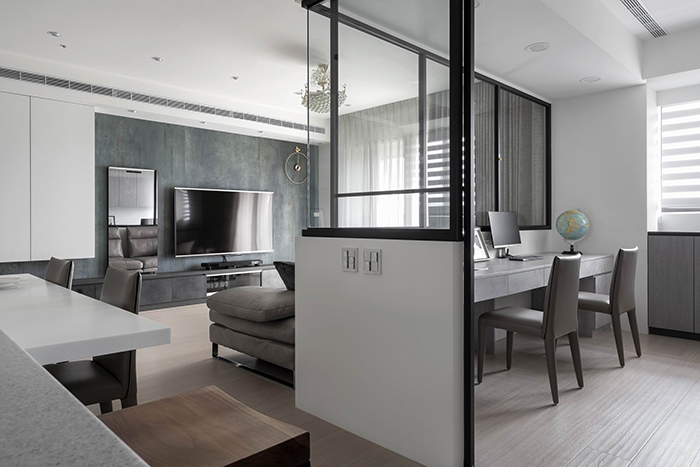 半開放的書房聯接客廳,男主人同時計畫行程,同時瀏覽電視