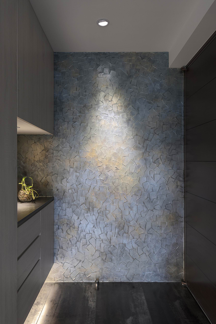 進門玄關用深色櫃體,窯變金屬光澤地磚,土質創作款/斑藍喚彩立體面主牆